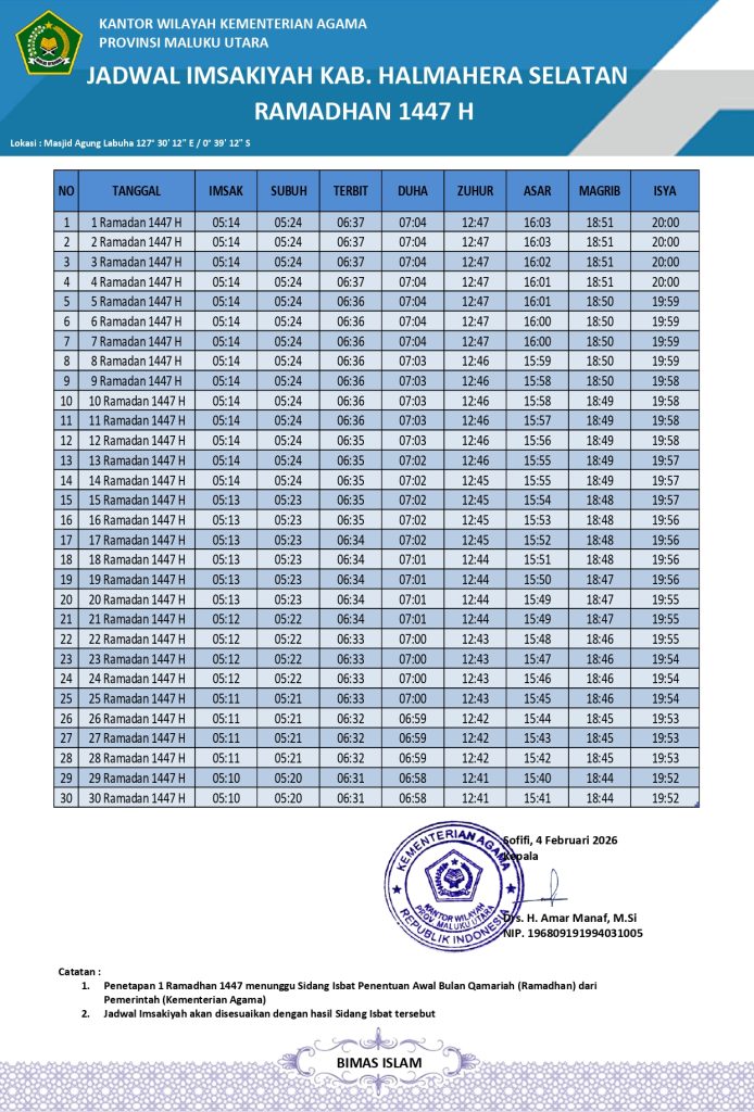 Kemenag Maluku Utara Rilis Jadwal Imsakiyah Ramadan 1447 H untuk Wilayah Halmahera Selatan
